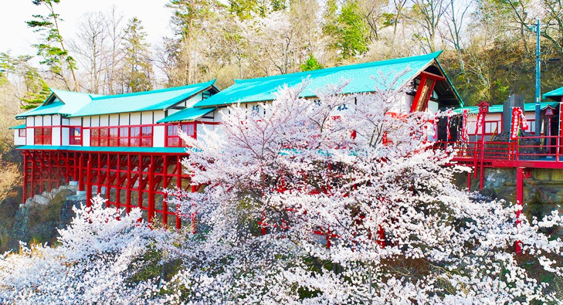 春になると、社殿の上手に植えられた桜が満開となり、眼下に流れる湯川に花びらが映り込む美しい光景が広がります。